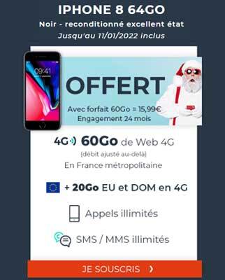 Le second pack promotionnel commercialisé par Cdiscount Mobile inclut un iPhone 8 offert pour toute souscription au forfait 60 Go de l’opérateur. Le smartphone Apple fourni gratuitement dans le cadre de ce bon plan est un modèle 64 Go noir reconditionné en excellent état.