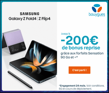 Dans le cadre des offres de précommande de Bouygues Telecom sur les Samsung Galaxy Z Flip4 et Galaxy Z Fold4, il est nécessaire de souscrire au forfait Sensation 170 Go pour obtenir l’un de ces smartphones pliables à moindre coût. Conditionné à deux années d’engagement, l’abonnement maxi data en question vous reviendra mensuellement à 31,99 € pendant un an et 48,99 € par la suite. Si vous êtes client Bbox, il vous sera néanmoins facturé avec un rabais de 6 € par mois.