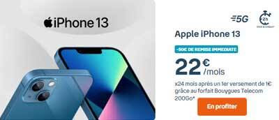 Jusqu’au 30 octobre 2022, Bouygues Telecom vous permet de profiter d’une remise immédiate exceptionnelle de 50 € sur l’iPhone 13. Ce bon plan fonctionne avec le forfait Sensation 200 Go de l’opérateur. Si vous saisissez cette promo pour acquérir le smartphone Apple en version 128 Go, vous ne paierez donc que :