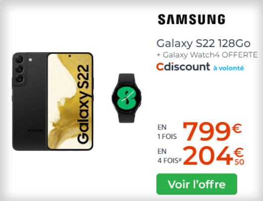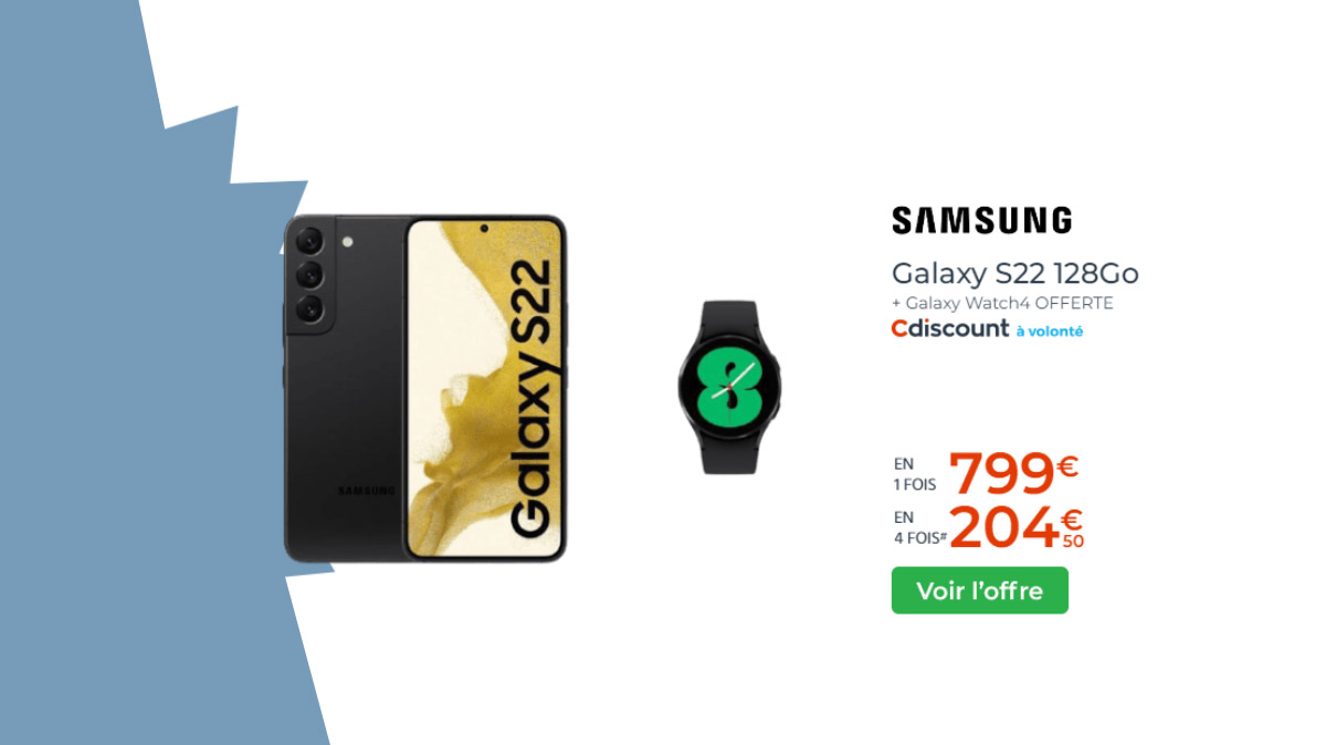 L'enseigne propose dans le cadre de son opération "Black November", un pack avec le Samsung Galaxy S22 et une Galaxy Watch 4 offerte. Vous pouvez en profiter pour 799€ et si vous le souhaitez, vous avez la possibilité de payer en 4 fois.