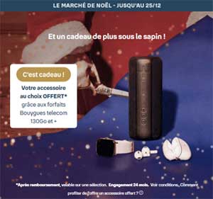 Outre la possibilité d’obtenir un nouveau smartphone sans vous ruiner, Bouygues Telecom vous fait une autre jolie surprise en cette période de fin d’année. Si vous profitez de l’opération Marché de Noël avec un forfait 130 Go ou plus, l’opérateur vous offrira un accessoire pour accompagner votre appareil mobile. Montre connectée, écouteurs sans fil, etc. : choisissez le cadeau que vous voulez ajouter au pied du sapin !