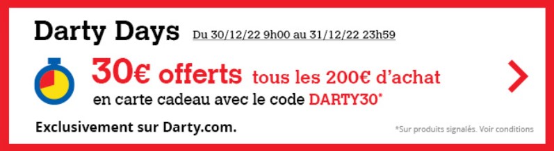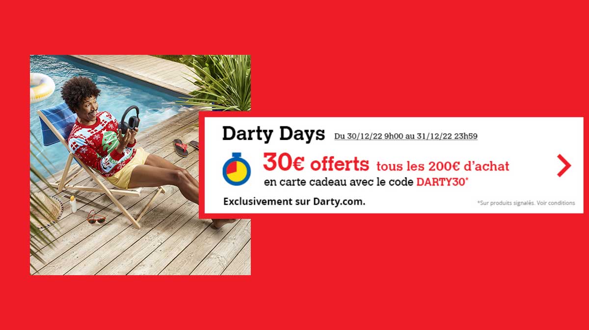 C'est la surprise du jour ! Darty lance une opération express de seulement 48h valable seulement sur son site en ligne. Dès maintenant et jusqu'au 31 décembre 2022 à 23h59, l'enseigne vous offre un code promo qui vous offre 30€ de carte cadeau tous les 200€ d'achat. Pour profiter de cette offre, il vous suffit d'ajouter le code DARTY30 lors de la validation de votre panier. Un petit message indiquant le montant de votre carte cadeau s'affichera à l'emplacement du code promo.