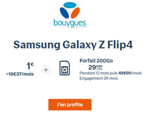 En ce moment, Bouygues Telecom vous propose d’acquérir le Samsung Galaxy Z Flip4 en version 256 Go à prix promo avec son forfait 200 Go. L’appareil mobile pliable du constructeur sud-coréen vous reviendra à seulement 1 € + 18,37 € par mois pendant deux ans en choisissant la formule de financement smartphone 0 %.