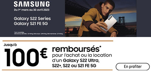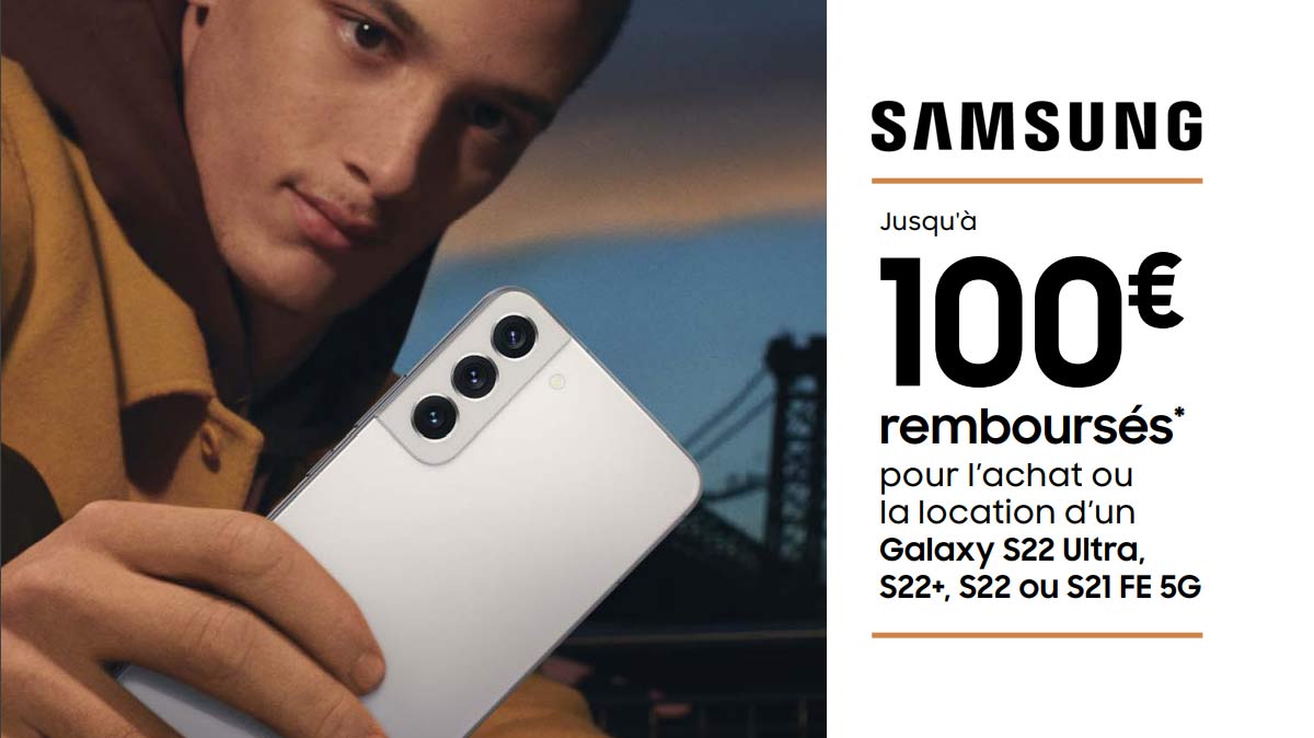 Du 1er mars au 30 avril 2023, Samsung lance une offre exceptionnelle qui ne laissera personne indifférent. En effet, pour tout achat ou location d'un Galaxy S22 Ultra, S22+, S22 ou S21 FE (tous modèles, tous coloris), Samsung vous remboursera jusqu'à 100€. Cette offre est valable pour tous les clients résidant en France métropolitaine et les démarches à suivre pour bénéficier de l'offre sont très simples.