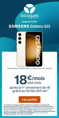 Jusqu’au 31 mai 2023, Bouygues Telecom casse le prix du Samsung Galaxy S23. Chez l’opérateur, le modèle 128 Go de cet appareil mobile haut de gamme est en effet proposé à seulement 1 € + 17,91 € par mois pendant deux ans pour toute souscription à un forfait 200 Go.