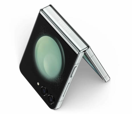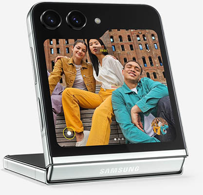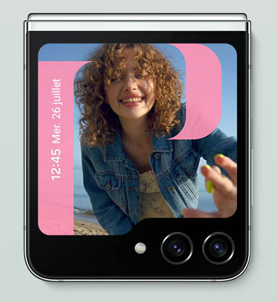 Le smartphone à clapet de Samsung est disponible dans plusieurs coloris, et il est possible de personnaliser les coques pour créer une combinaison unique parmi des centaines d'options de couleurs, y compris pour la charnière. Les capteurs photo sont soigneusement intégrés à l'écran externe, et le téléphone dispose d'un bouton de mise en veille qui fait également office de lecteur d'empreintes digitales.