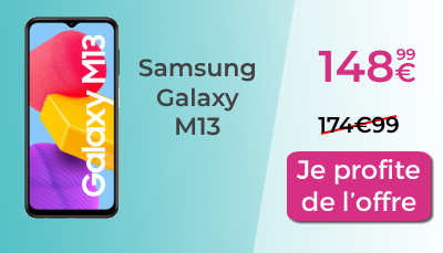 Avec le Samsung Galaxy M13, vous n'aurez pas à dépenser des centaines d'euros pour obtenir un smartphone capable d'accomplir toutes vos tâches quotidiennes. D'un poids de 192 grammes, le Samsung Galaxy M13 est un smartphone 4G équipé d'un écran LCD de 6,6 pouces. De résolution Full HD+, son taux de fréquence d'affichage est de 60Hz. Doté d'un processeur Exynos 850, ce mobile Samsung embarque aussi 4 Go de RAM et 64 Go de stockage. Son emplacement pour carte micro-SD permet d'étendre l'espace : vous pouvez ainsi profiter jusqu'à 1 To supplémentaire.