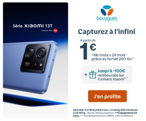 Conditionné à deux années d’engagement, le forfait 200 Go de Bouygues Telecom vous est proposé à 31,99 € par mois pendant 6 mois (puis 44,99 € par mois) avec une remise mensuelle de 5 € si vous êtes client Bbox. Si vous souscrivez cette offre 4G/5G pour obtenir votre Xiaomi 13T ou 13T Pro moins cher, vous profiterez des appels et des SMS sans limites en France métropolitaine, ainsi que vers l’Europe, les DOM et la Suisse. Ces mêmes services de communication + votre enveloppe data de 200 Go seront accessibles lors de vos voyages en Outre-mer, en Europe et en Suisse.