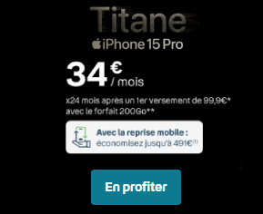 Même si l’iPhone 15 est un smartphone premium, il est possible de monter en gamme avec l’iPhone 15 Pro. Et vous savez quoi ? Chez Bouygues Telecom, ce modèle est aussi accessible à prix cassé avec un forfait 200 Go. Ainsi, en prenant l’abonnement maxi data de l’opérateur, la version 128 Go de l’appareil mobile Apple vous reviendra à seulement :