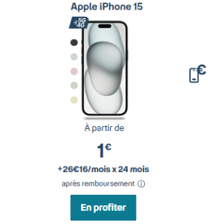 Dans les faits, une souscription à l’offre 200 Go de Bouygues Telecom vous donnera automatiquement accès à une réduction immédiate de 347,10 € sur l’iPhone 15 128 Go. Cette remise colossale sera ensuite complétée par un remboursement de 80 € post-achat.