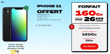 NRJ Mobile offre la possibilité d'acquérir gratuitement un iPhone 11 ! Le smartphone Apple que vous recevrez est un modèle noir avec une mémoire de 64 Go, reconditionné en très bon état. Bénéficiant d'une garantie de 24 mois, il vous sera livré sans frais. Pour obtenir cet iPhone 11 sans débourser le moindre centime, il vous suffit de souscrire au forfait mobile de 160 Go de NRJ Mobile, affiché à seulement 26,99 € par mois, avec un engagement de 24 mois. Une offre aussi avantageuse ne se refuse pas !