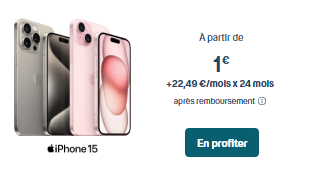Chez Bouygues Telecom, c’est seulement 1 € + 22,49 € par mois pendant deux ans pour l’iPhone 15 !